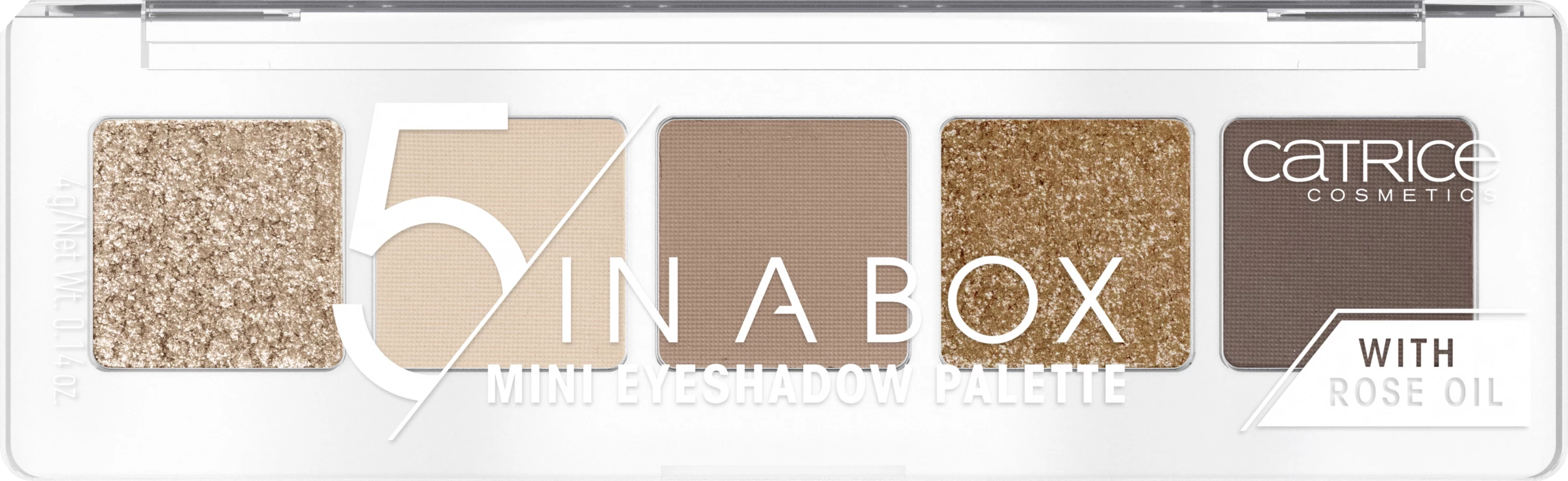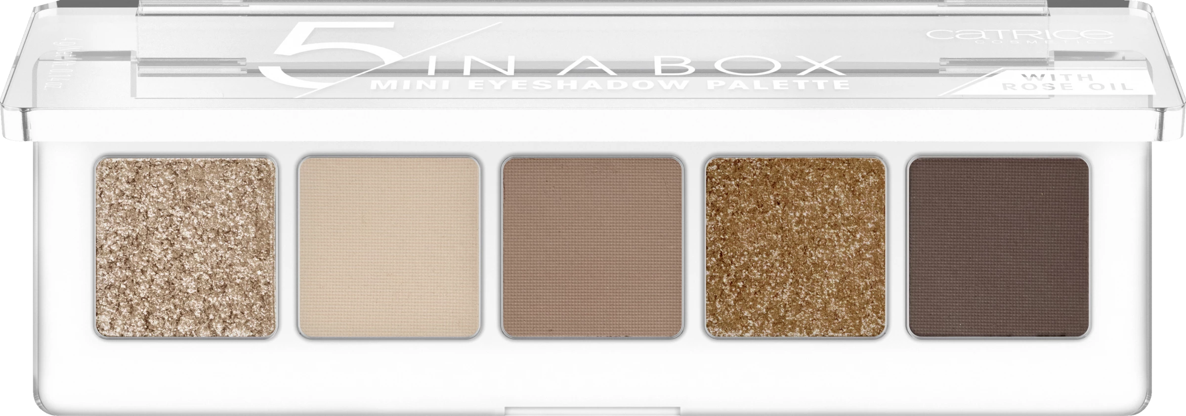 Den perfekten Augen-Make-up-Look immer dabei – das hat man jetzt mit der 5 In A Box Mini Eyeshadow Palette in praktischer Reisegröße. Die vier neuen Paletten sind frei von Mikroplastikpartikeln und enthalten jeweils fünf Shades, mit denen sich in Sekundenschnelle wunderschöne, komplette Eye-Make-up-Looks kreieren lassen. Die hochpigmentierten Nuancen mit wertvollem Rosenöl sind super soft und lassen sich so ganz einfach verblenden. Die Farbwelt rangiert von Nude und Gold über Rosentöne und rötliche Erdnuancen bis zu kühlen Taupe- und Graushades.