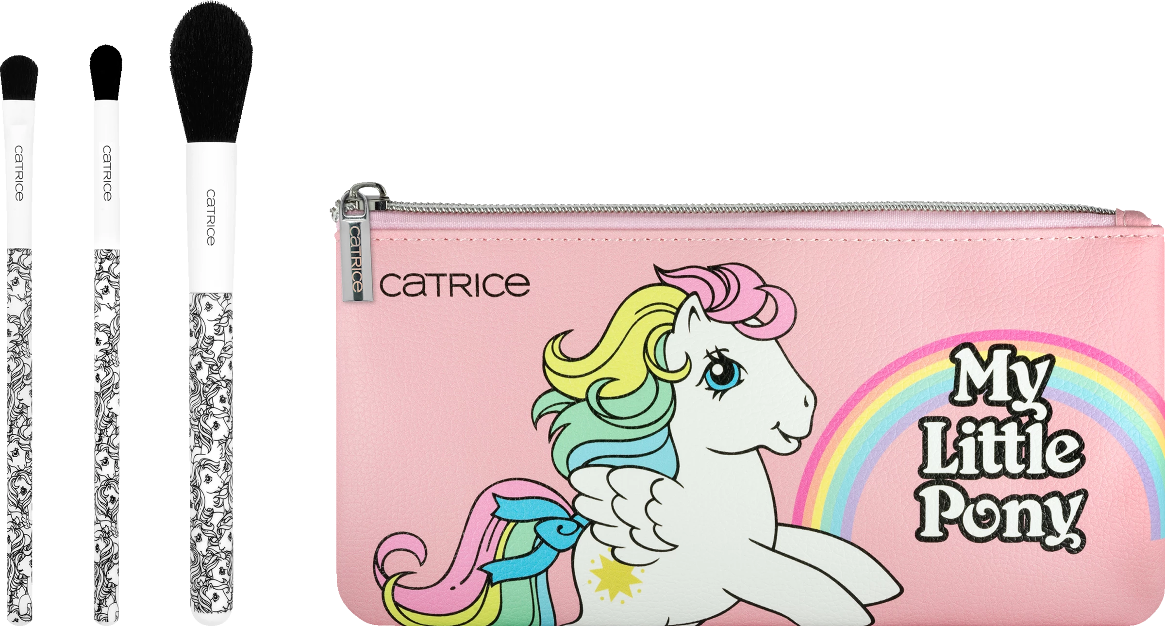 Das Brush Set + Bag ist der perfekte Partner in Crime für die Eyeshadow Palette und den Highlighter der CATRICE My Little Pony Limited Edition. Das Set besteht aus einem Highlighter Brush, einem Shading Brush und einem Blender Brush – alles in einer supersüßen rosafarbenen Make-up-Tasche mit My Little Pony Logo inklusive Regenbogen und Pegasuspony mit Regenbogenmähne. Der Highlighter Brush ist optimal geformt, um den Highlighter präzise aufzutragen und anschließend zu verblenden. Mit dem Shading Brush lassen sich die Lidschatten der Eyeshadow Palette ganz einfach aufnehmen und auftragen, mit dem Blender Brush kann die Textur easy verblendet werden.
