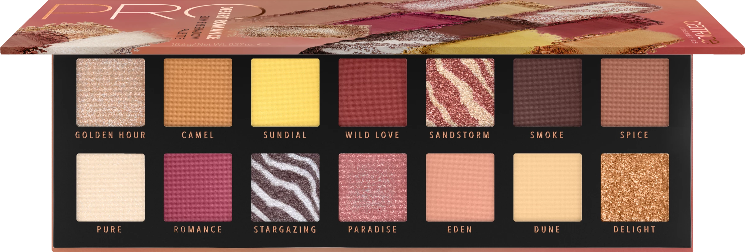 Mit der CATRICE Pro Eyeshadow Palette im hochwertigen Paper Packaging gelingen „Pro-like“ Looks garantiert. Die high quality Palette überzeugt mit 14 hochpigmentierten Lidschatten. Die von der Wüste inspirierten Farben dieser Palette reichen jeweils von metallisch-schimmernd bis matt, um abwechslungsreiche und ausdrucksstarke Augen-Make-ups zu kreieren.