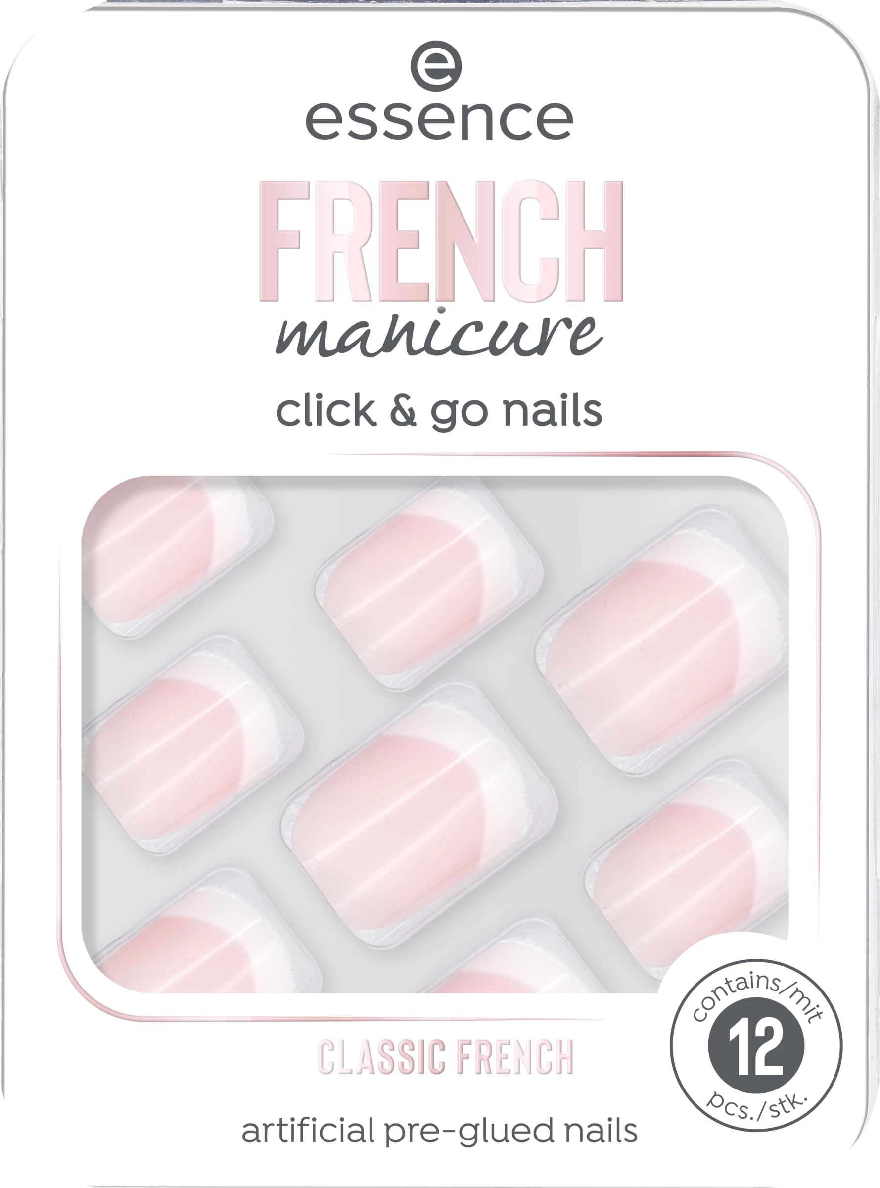 Geliebt und heiß begehrt: Die click ’n go nails. Zwölf selbstklebende Kunstnägel verleihen den Nägeln ruck zuck einen professionellen French Look wie aus dem Studio. Einfach die passende Größe auswählen, auf den Nagel kleben und fest andrücken. Schon sind die Hände wieder ausgehfein – und das für bis zu drei Tage! Die Nails gibt es in zwei Varianten: für einen Classic French Look oder den Babyboomer Style.