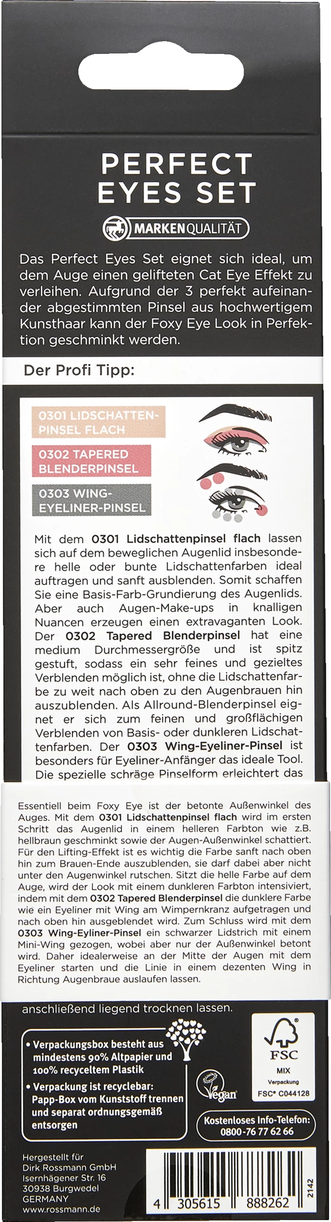 Das Perfect Eyes Set eignet sich ideal, um dem Auge einen gelifteten Cat Eye Efekt zu verleihen. Aufgrund der 3 perfekt aufeinander abgestimmten Pinsel aus hochwertigem Kunsthaar kann der Foxy Eye Look in Perfektion geschminkt werden.