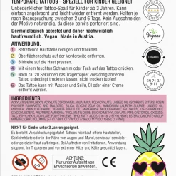 Nicht für Kinder unter 3 Jahren geeignet. Es besteht Verschluckungsgefahr! Tattoos nicht auf offene Hautstellen, Schleimhäute oder in der Nähe von Augen und Mund, sowie auf sensibler oder gereizter Haut aufbringen. Bei Auftreten von Irritationen, Anwendung stoppen. Nur unter Aufsicht von Erwachsenen anwenden!