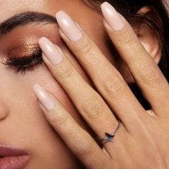 Wähle die richtigen Größen aus, indem du den NAILD-Nagel an deinen Naturnagel anlegst. Die Wahl einer kleineren Größe ist vollkommen in Ordnung, solange es bequem ist. Wenn der NAILD-Nagel zu groß ist, geht er an den Seiten deines natürlichen Nagelbettes vorbei. Du kannst die Seiten einfach zurechtfeilen.Trage 1 bis 2 Tropfen NAILD-Kleber auf die Rückseite des NAILD-Nagels auf. Alternativ kannst du den Klebstoff auf den gesamten natürlichen Nagel auftragen. Achte darauf, dass du den Kleber nicht zu nahe an der Haut aufträgst, da er sich unter Druck verteilt. Warte 5 Sekunden. Den NAILD-Nagel leicht unter der Nagelhaut ausrichten und mit dem Daumen nach unten drücken. Halte mindestens 25 Sekunden fest und stelle sicher, dass der gesamte NAILD-Nagel bedeckt ist und Druck erhäl