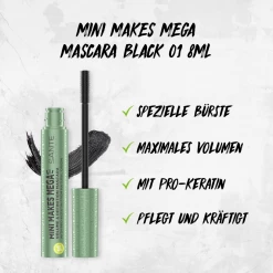 Mini-Bürste – Maximales Volumen! Die spezielle Minigummibürste erfasst selbst die kürzesten Wimpern und schenkt so maximales Volumen und lässt die Wimpern dichter und länger erscheinen. Die hochwertige Formel mit Pro-Keratin natürlichen Ursprungs pflegt und kräftigt die Wimpern. Naturkosmetik. Stärkende, volumengebende Formel, auch bei empfindlichen Augen.
