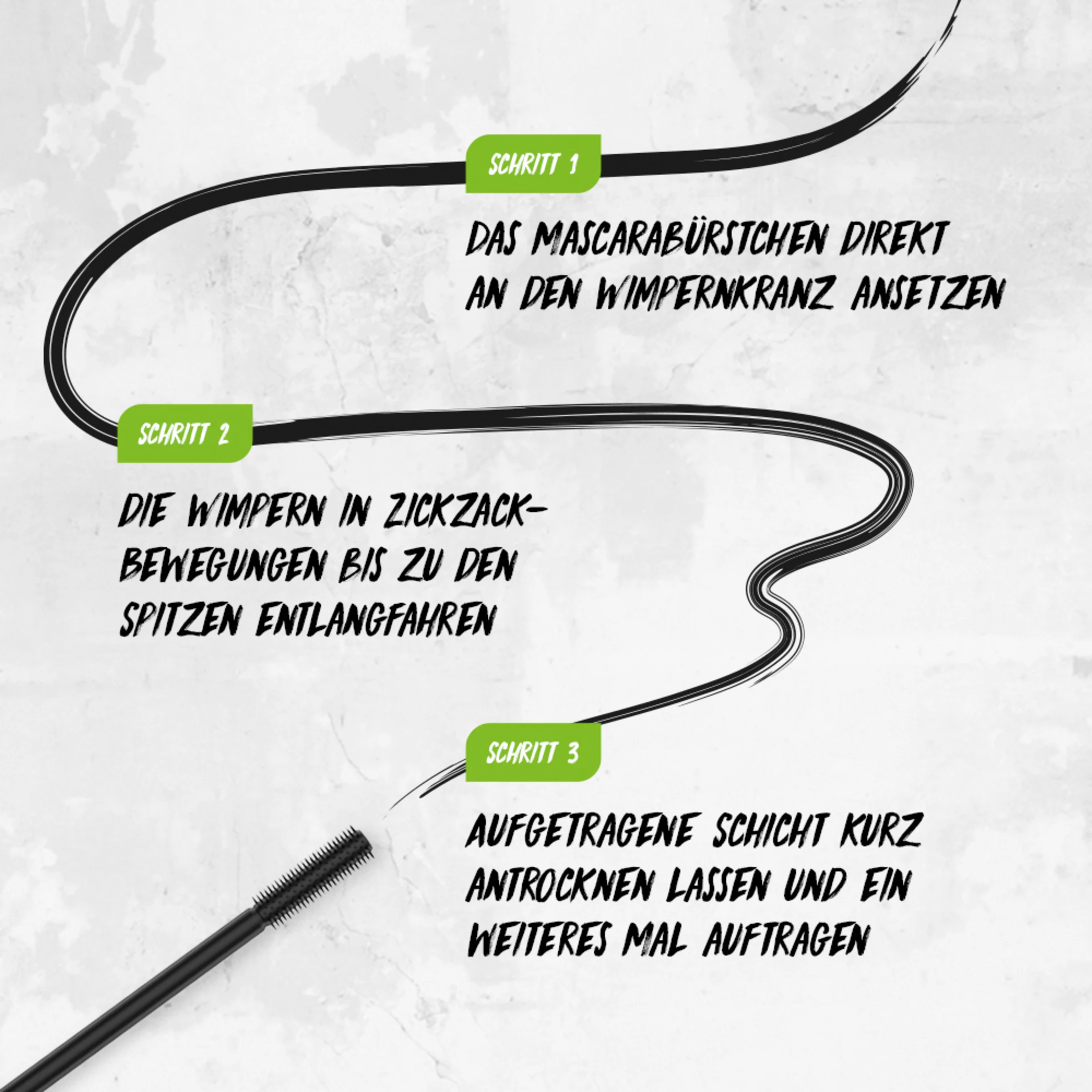 Das Mascarabürstchen direkt an den Wimpernkranz ansetzen und die Wimpern in Zickzack-Bewegungen bis zu den Spitzen entlangfahren. Für ein voluminöseres Ergebnis: Aufgetragene Schicht kurz antrocknen lassen und ein weiteres Mal auftragen.
